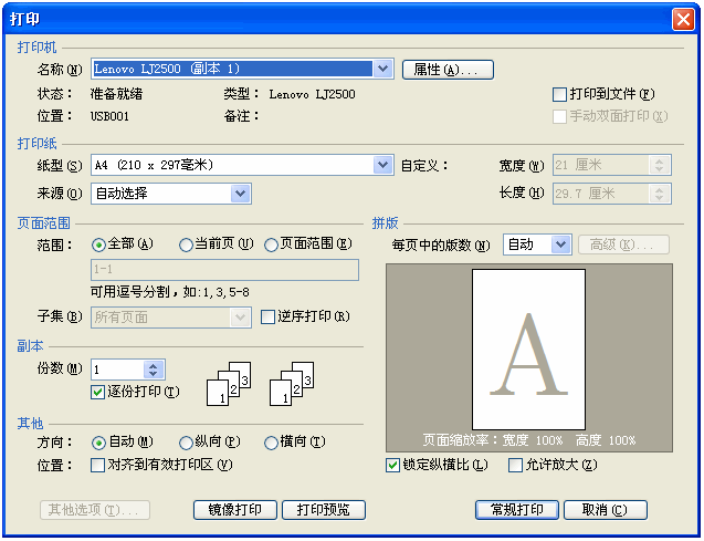 注:打印将提交到操作系统后由系统打印管理程序全全负责进行后台打印。因此,在文档打印期间可进行其他操作,甚至也可以关闭程序窗口。