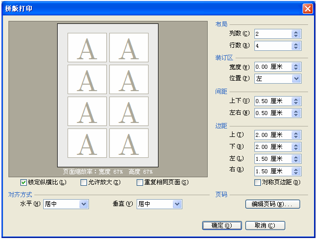 指示打印页中排列的页面都是相同的页面,即用一个页面铺满一个打印纸。比如,用户设计的一张名片,可在一个打印纸上摆放很多。