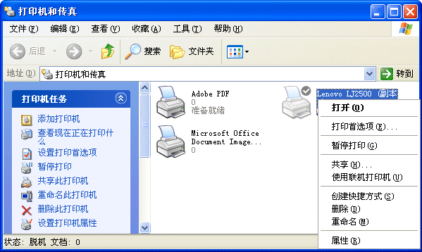 以 WindowsXP 为例,选择“开始|设置|打印机或传真”,打开"打印机传真"窗口,如下图所示。