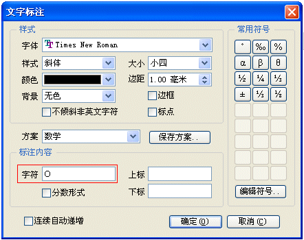 在对话框中的“文字”编辑框中,输入字符“O”,单击“确定”按钮关闭对话框。移动光标到视图,点击圆心 O,并按住鼠标左键向右上角拖动,将文字位置设置好,如下图: