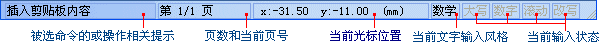 此部分显示的内容随文字编辑状态和图形编辑状态有所不同。在文字编辑状态下,将显示插入符所处的行号、列号、段落缩进级别以及公式文字嵌套深度;在图形编辑状态下,则显示当前光标位置或被捕捉的捕捉点位置。 -