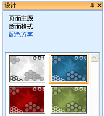 设计视图的内容分为“页面主题”、“版面格式”以及“配色方案”。其中,在“页面主题”列表中列出的是母版信息,列表中的每一个页面都代表着一个母版,而有一个母版页总是处于选定状态,用户也可以改选。点击“版面格式”切换列表,此时,列表中显示的是当前选定母版下的所有版式页信息。单击“配色方案”再次切换列表,此时,列表中显示的是基于当前版式页的若干个配色页面,每一个页面对应于一个母版内置的配色方案。若没有内置配色方案,则此列表为空。