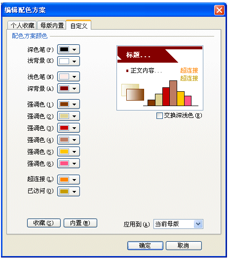 将当前编辑好的配色方案内置到当前活动母版,也就是说把配色方案包含到文档中去。按此按钮后,被内置的配色方案将暂时添加在“母版内置”选项页中的列表中。被存储到文档中的内置配色方案应用到页面以后,可以通过此对话框间接得到修改。 -