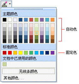 其中“主题颜色”中共列出了10个颜色,对应于颜色方案中的前10个颜色。配色方案中的最后两个颜色没有列出在这里,这两个颜色用于超连接文字颜色,不推荐用户在文档中另做它用。在“主题颜色”中,第一行也就是配色方案中用户定义的配色方案颜色。而下方的