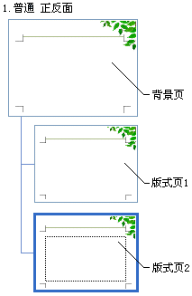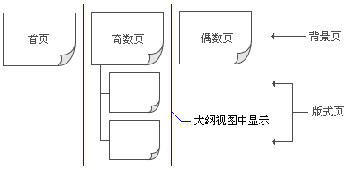 背景页是在页层次中位于最下方的一个页面。背景页类似于一个图纸页,可以向其中绘制图案。背景页的主要任务是为其上面的的版式页和文档页提供可共享的背景或背景图案。背景页的数量可能为 1 或者 2 或者 3,即奇数页背景(正面)、偶数页背景(反面)以及首页背景(标题页)。可以在页面设置中的“背景和版式”选项页中为母版配置背景页。其中,奇数页背景必须存在,若不存在偶数页背景或首页背景,则均由奇数页背景来负责其背景。在大纲视图中,每个母版总是只显示一个背景页,并在其上方用括号内文字标记。到底应显示哪个背景页取决于当前前景页是首页还是奇数页还是偶数页,依此各个背景页轮番被显示。下图为当前前景页页码为奇数的时候大纲视图显示母版情况。