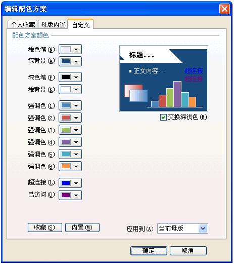 变体中的填充样式图案分为两行。上一行的小一点的样式框表示填充类型,而下方的较大一点的 12 个样式框为具体填充样式,它们对应于当前配色方案中的 12 个颜色值。只所以称这些填充样式为“变体”,是因为这些填充样式是根据配色方案中的颜色设置而动态发生变化的。变体的前三种样式,即“纯色”、“聚光”、“饰灯”为预定义的填充方案,第一种为单色填充样式,后两种为渐变色填充样式。而后面的三种填充样式,即“深色”、“浅色”、“实色”为仅当用户选定的填充样式为纹理填充样式或图片填充样式的时候出现。它是对填充样式中的位图进行着色处理后得到的结果。着色是根据配色方案中的颜色配置进行的。采用变体中的填充样式意味着当配色方案变化时,这些填充样式也将相应地发生着色变化。在变体样式选择框内,在上一行填充样式种类中选择一个样式框后,在下面的两行样式框中选择一个具体的样式即可。 -